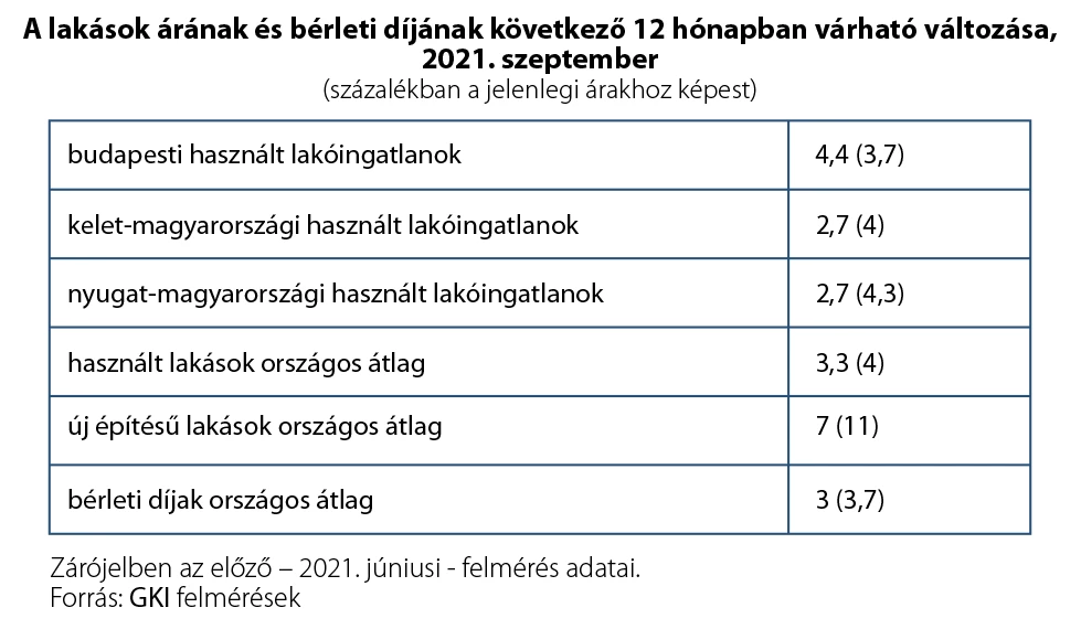 A lakásvásárlásra és építésre vonatkozó lakossági várakozások a 2020 második negyedévi mélypont és 2021 első negyede között folyamatosan javultak, de júniusban megtorpant a javuló trend. A jelen felmérés során ismét javulás regisztrálható, lényegében a fél évvel ezelőtti várakozások köszöntek vissza. A 2021. szeptemberi felmérés adatai alapján Magyarországon a következő egy évben 74 ezer biztosan és 180 ezer valószínűleg lakást építeni vagy vásárolni szándékozó háztartás lehet.