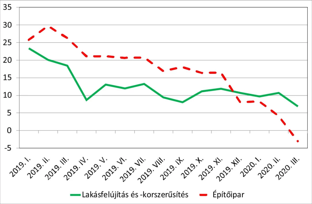 A GKI felmérése szerint az építőipari bizalmi index, vagyis a szektor gazdasági kilátásai 2019 eleje óta lényegében folyamatosan romlanak. A lakásfelújítás és -korszerűsítés terén működő cégek várakozásai is mutattak kisebb visszaesést, de az elmúlt egy évben a stagnálás a meghatározó tendencia. Ez alapján valószínű, hogy ha az építési piac a jelenlegi „hibernált” állapotából feléled, a felújítási és korszerűsítési piac számottevően élénkülhet. E szegmens növekedése a lakásépítésnél jóval kedvezőbb lehet, különösen, mert a kedvezményes áfa-kulcs megszűnése ez utóbbi területet alaposan „hazavágta”.