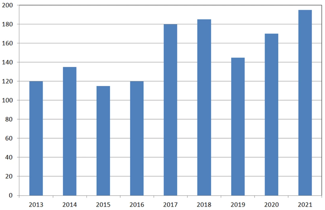 A felújított és korszerűsített lakások száma, 2013-2021 (darab)