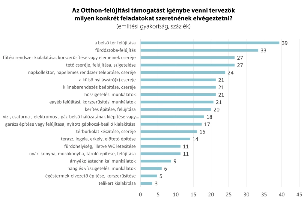 A legnépszerűbb cél változatlanul a lakóingatlanok belső tereinek felújítása (ami a belső fali, padló, álmennyezeti burkolat cseréjét, felújítását, illetve ezek festését, tapétázását jelenti). Ezt a válaszadók 39%-a jelölte meg. Harmaduk a fürdőszoba korszerűsítését szeretné elvégeztetni. A fűtési rendszer korszerűsítése, illetve a tetőfelújítás iránti igény népszerűsége sem marad el lényegesen ezektől, a megkérdezettek bő negyede szeretné ezeket elvégeztetni. A napkollektor vagy napelemes rendszer kiépítése iránt a jelen felmérés során minden negyedik válaszadó érdeklődött. Egy évvel ezelőtt még minden hetedik tette egyanezt. Ez az érezhető növekedés annak is betudható, hogy ennek támogatására az Otthonfelújítási programon kívül is állnak rendelkezésre célzott pályázati források. A külső nyílászárók cseréje iránt minden ötödik válaszadó érdeklődött, egy évvel ezelőtt még minden negyedik. Hasonló népszerűségnek örvend a klímaberendezések beszerelése vagy cseréje, illetve a hőszigetelési munkálatok.