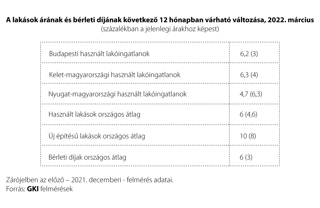 A lakásvásárlásra és építésre vonatkozó lakossági várakozások – feltehetően nem függetlenül az orosz-ukrán háborútól – negyedéves alapon érezhetően romlottak. Mindez azonban éves alapon nem jelent visszaesést. A 2022. márciusi felmérés során 84 ezer háztartás nyilatkozott úgy, hogy a következő egy évben biztosan vásárol vagy építtet lakást, míg további 180 ezer háztartás szándéka valószínű volt. (2021. decemberében ugyanez a két érték 95 és 224 ezer volt, 2021 márciusában pedig 72 és 201 ezer.)
