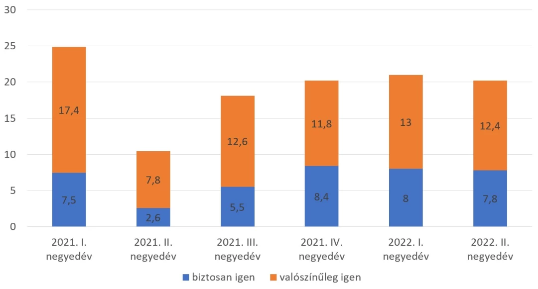 A lakások felújításához, korszerűsítéséhez többféle állami támogatás is elérhető. Ezek „zászlóshajója” az Otthon-felújítási program, ami a jelenlegi szabályozás szerint 2022. december 31-ig biztosít forrásokat. Ilyen célra felhasználható még a falusi csok, illetve a célzott támogatási programok forrása is. Mindez széles körű érdeklődést váltott ki a gyereket nevelő családok körében. Az idei második negyedévben a válaszadó háztartások 7,8%-a biztosan szeretne lakásfelújításhoz és korszerűsítéshez kapcsolódóan 2022 végéig állami támogatást felvenni, s további 12,4% valószínűleg igénybe venné ezt a fajta támogatást. A jelen felmérés eredménye az egy negyedévvel ezelőttihez képest hibahatáron belüli elmozdulást jelent. Vagyis az állami támogatások lakáskorszerűsítésekhez és -felújításokhoz való felhasználása továbbra is igen népszerű. Az állami támogatás igénylése a családiház-tulajdonosok körében a legelterjedtebb - ezek 10%-a biztos, 14%-a valószínű résztvevőnek mondta magát. A társasházakban élők 3%-a lehet biztosan és 9% a valószínűleg érintett. Az állami támogatás iránti érdeklődés a fiatalok (a 30 év alattiak) körében a legmagasabb, a biztosan és valószínűleg támogatást felvevők aránya 11 és 21%. Az életkor előre haladásával csökken az érdeklődés, a 60 év felettiek körében ugyanez a két arány már csak 4 és 6%. Valamelyest érezhető a települési lejtő hatása is: a legalacsonyabb a program iránti érdeklődés a fővárosban (8 és 10%), a legmagasabb a községekben (10 és 14%).