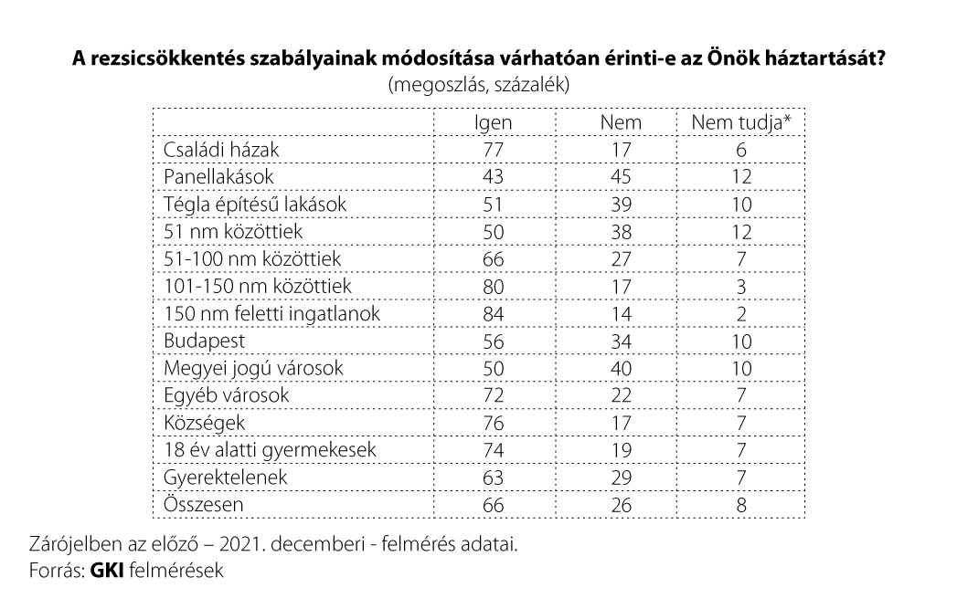 A rezsiemelés hatásai tehát várhatóan a legnagyobb mértékben a családi házak és az átlagosnál nagyobb alapterületű lakóingatlanok lakói, a kisebb városokban és községekben élők, illetve a gyermeket nevelők számára lesznek érzékelhetők. A panellakásban élők kisebb aggodalmát feltetőleg a távfűtési díjak egyelőre változatlan szabályozása magyarázza.