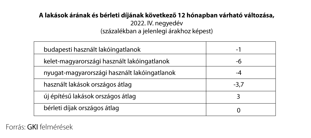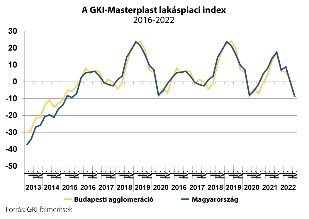 A lakáspiaci indexek 2022-ben csaknem folyamatosan csökkentek, azaz a pici kilátások romlóak. A jelen felmérés során előállt GKI-Masterplast fővárosi lakáspiaci index (amely az ingatlanos cégek, illetve a lakosság várakozásait sűríti egyetlen számba) negyedéves alapon 10, éves alapon 26 ponttal csökkent. Az ország egészére vonatkozó index negyedéves alapon 9, éves alapon 27 pontos szűkülést mutat. Az aktuális indexértékek a pandémia mélypontján mért értékeket idézik.